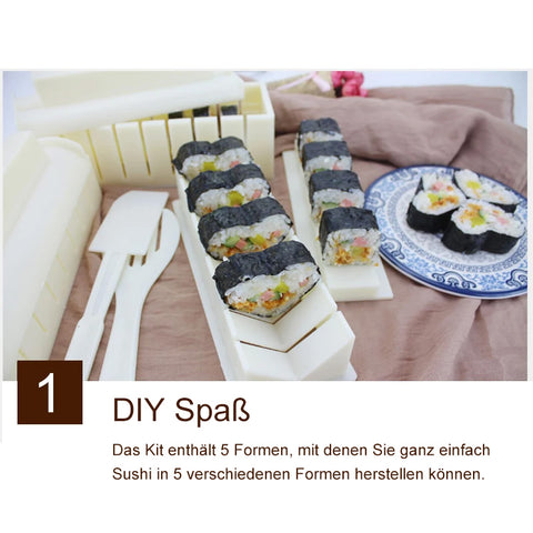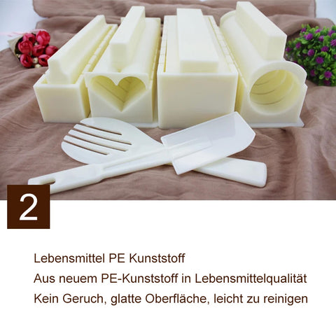 Das Kit enthält 5 Formen, mit denen Sie ganz einfach Sushi in 5 verschiedenen Formen herstellen können: