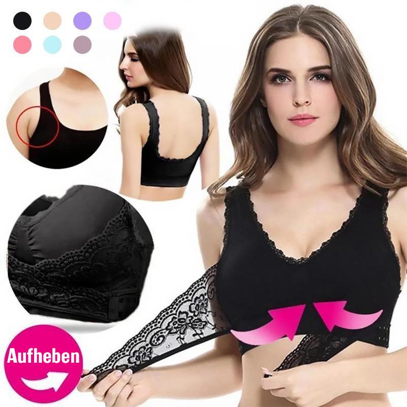Der Drahtloser vorderer Kreuzschnallen-Spitzenlift-BH verfügt über ein verstellbares, kreuz und quer verlaufendes Spitzenriemen-Design, das Ihre Brust für einen sofortigen Lift mit purem Komfort wiegt!