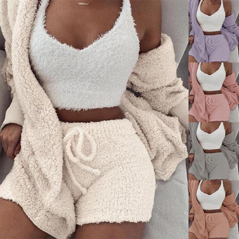 1* Flauschiger Kapuzenmantel mit kurzer Hose und Leibchen