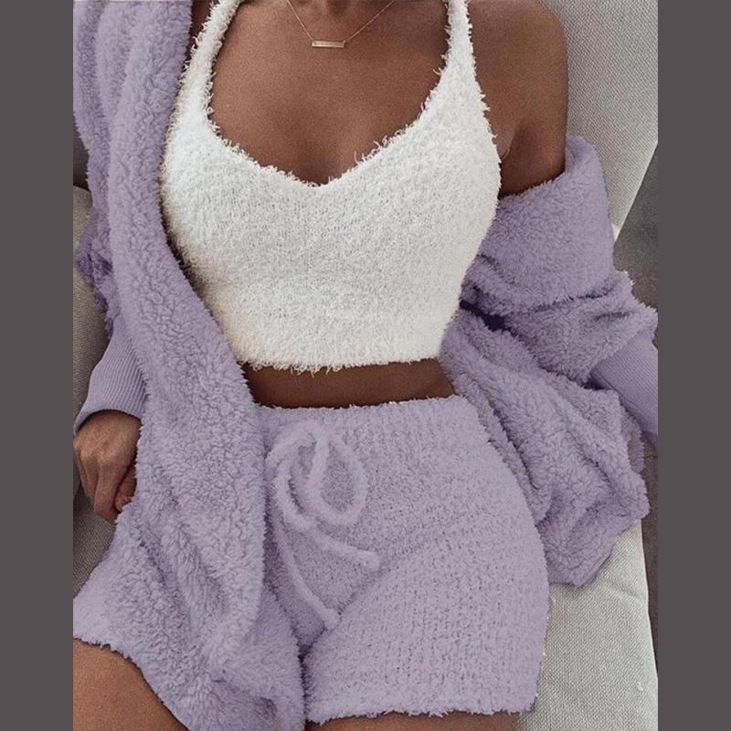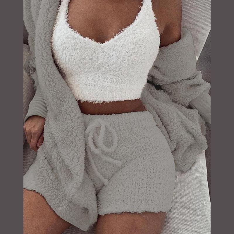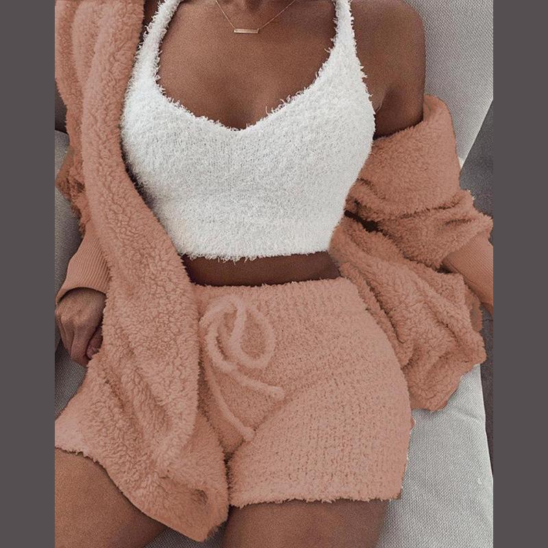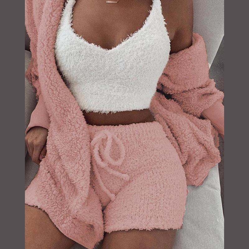 Flauschiger Kapuzenmantel mit kurzer Hose und Leibchen