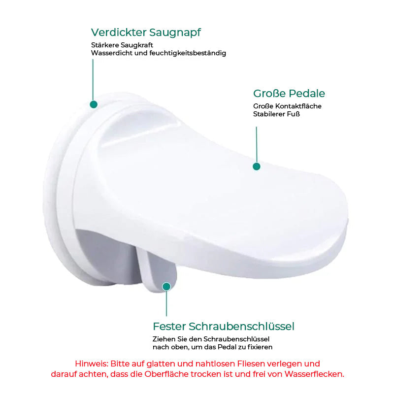 Design: Wenn Sie jemals versucht haben, sich zu bücken, um unter der Dusche Ihre Füße zu waschen oder Ihre Beine zu rasieren, wissen Sie, dass das Bücken unbequem und unbequem ist. Jetzt gibt es ein spezielles Fußpedal, das Ihnen dabei hilft. Lässt sich neigen, um das Gleichgewicht zu verbessern, wodurch unangenehme Beugungen und Streckungen überflüssig werden und das Verletzungsrisiko vermieden wird.