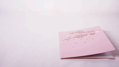 Einmal geöffnet, zeigt diese Karte einen atemberaubenden rosa Kirschblütenbaum in voller Blüte. Und umgeben von Kirschblüten-Blütenblattverzierungen um die Basis des Baumes.