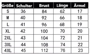 - Diese Größentabelle dient nur zu Referenzzwecken. Die Größe variiert zwischen den Produkten. Es ist Fitted Fit T-Shirt, das kleiner als ein einfaches T-Shirt fällt. Wir empfehlen Ihnen, ein oder zwei Größen zu bestellen, um das bestmögliche Ergebnis zu erzielen.