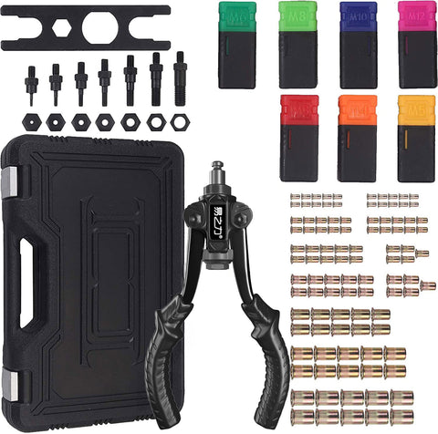 【STARK UND LANGLEBIG】 Das Nietmutterwerkzeug besteht aus dickem Kohlenstoffstahl mit wärmebehandelter und schwarzer Phosphatierung, die vor Korrosion schützt. Mit der entworfenen Struktur und den robusten Materialien ist es robust und langlebig genug für eine lange Lebensdauer.